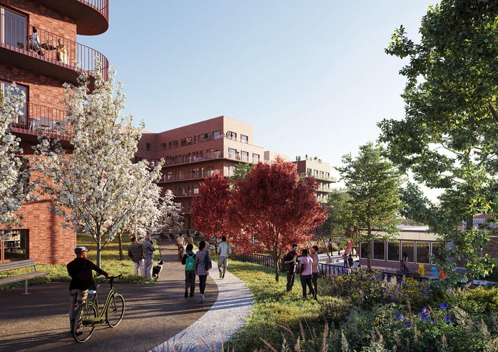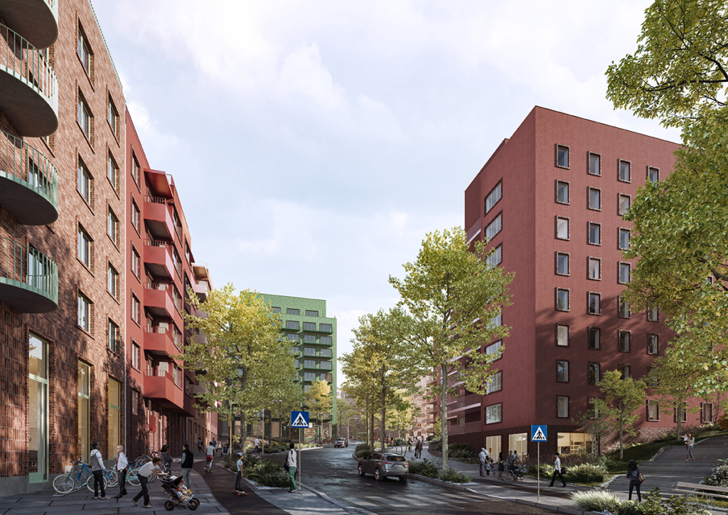 Bebyggelsen fördelas på femton kvarter längs en ny huvudgata som knyter ihop områdets olika delar, en gata som är anpassad för gång-, cykel- och kollektivtrafik.