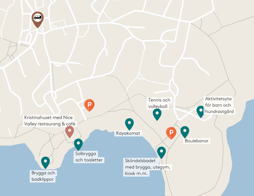 På Stora Sköndal kan du bada från strand, klippa eller brygga. Vid Drevvikens strand finns barnvänliga Sköndalsbadet med bad från både strand och brygga. Nedanför Kristinahuset finns en stor, härlig solbrygga. Alldeles intill ligger gångstråket Lövudden med bad från både klippor och brygga. Packa för en heldag med bad och häng på någon av de stora härliga grönytorna.